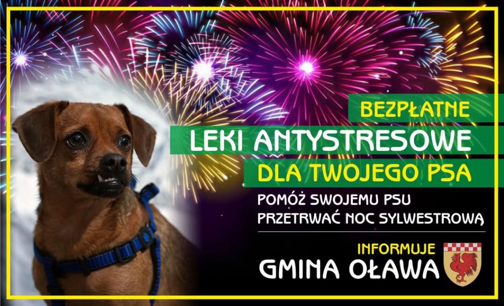Uwaga! Jeśli jesteś mieszkańcem Gminy Oława, a Twój pies obawia się fajerwerków i chcesz pomóc mu przetrwać Sylwestrową Noc, zgłoś się do Przychodni Weterynaryjnej Aksman w Oławie, ul. Świerkowa 34, po bezpieczne środki uspokajające/antystresowe.