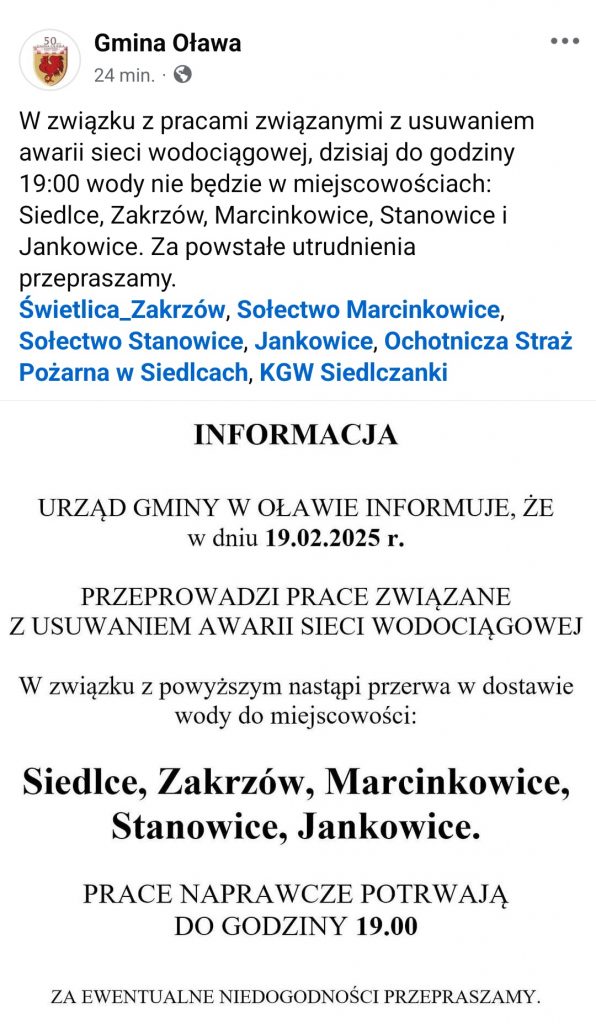 Brak wody w dniu dzisiejszym 19/02/2025r.-awaria !!! Może ci się spodobać również Zebranie Wiejskie 11 luty 2025r.( wtorek) godz.18.00 4 lutego 2025 Kolęda 04/01/2025 roku 29 grudnia 2024 Zebranie Wiejskie 26/09/2020 ( sobota ) 19 września 2020