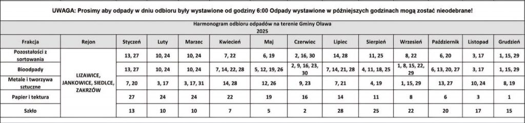 Harmonogram w wersji pdf dostępny na stronie Biuletynu Informacji Publicznej: https://bip.gminaolawa.pl/a,25797,harmonogram-odbioru-odpadow-na-terenie-gminy-olawa-w-2025-roku.html