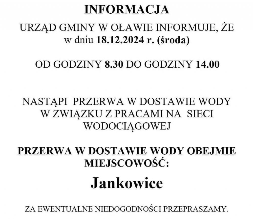 Przerwa w dostawie wody 18 grudnia 2024r. Może ci się spodobać również Gminne pojemniki na plastik i szkło 19 lutego 2025 Druga rata podatku !!! 10 maja 2023 Wygrana w konkursie dotarła do Jankowic. 22 grudnia 2016