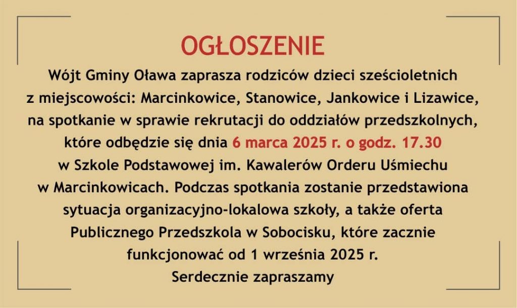 Wójt Gminy Oława zaprasza rodziców dzieci sześcioletnich na spotkanie w dniu 6 marca 2024r. o godz.17.30. Spotkanie odbędzie się w Szkole Podstawowej w Marcinkowicach